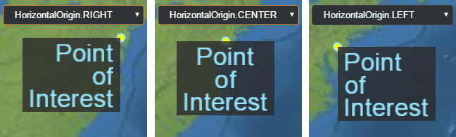HorizontalOrigin() Scene/HorizontalOrigin.js 22 The horizontal location of an origin relative to an object, e.g., a Billboard or Label. For example, setting the horizontal origin to LEFT or RIGHT will display a billboard to the left or right (in screen space) of the anchor position. See: Billboard#horizontalOrigin Label#horizontalOrigin Members staticconstantCesium.HorizontalOrigin.CENTER : Number Scene/HorizontalOrigin.js 29 The origin is at the horizontal center of the object. staticconstantCesium.HorizontalOrigin.LEFT : Number Scene/HorizontalOrigin.js 37 The origin is on the left side of the object. staticconstantCesium.HorizontalOrigin.RIGHT : Number Scene/HorizontalOrigin.js 45 The origin is on the right side of the object.